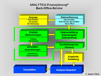 Der Back-Office-Service minimiert durch Aufteilung des Arbeitsprozesses den Aufwand für den Berater bezüglich der Durchführung der Analyse. Die kundenbezogenen Teile der Finanzplanung wie Datenerfassung, Analysegespräch, Ergebnisumsetzung, verbleiben beim Berater. Unser Back-Office übernimmt die Erstellung der kompletten Analyse (technischer Teil, Ergebniserarbeitung und Dokumentation, auf Wunsch auch mit strukturellen Handlungsempfehlungen). Der Berater kann sich auf die Umsetzung der vorgeschlagenen Maßnahmen konzentrieren.